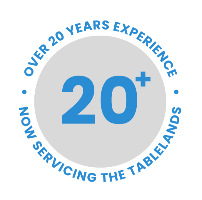 Blue and grey circular badge with white text reading 'Over 20 Years Experience,' 'Servicing the Tablelands,' and 'Now.'
